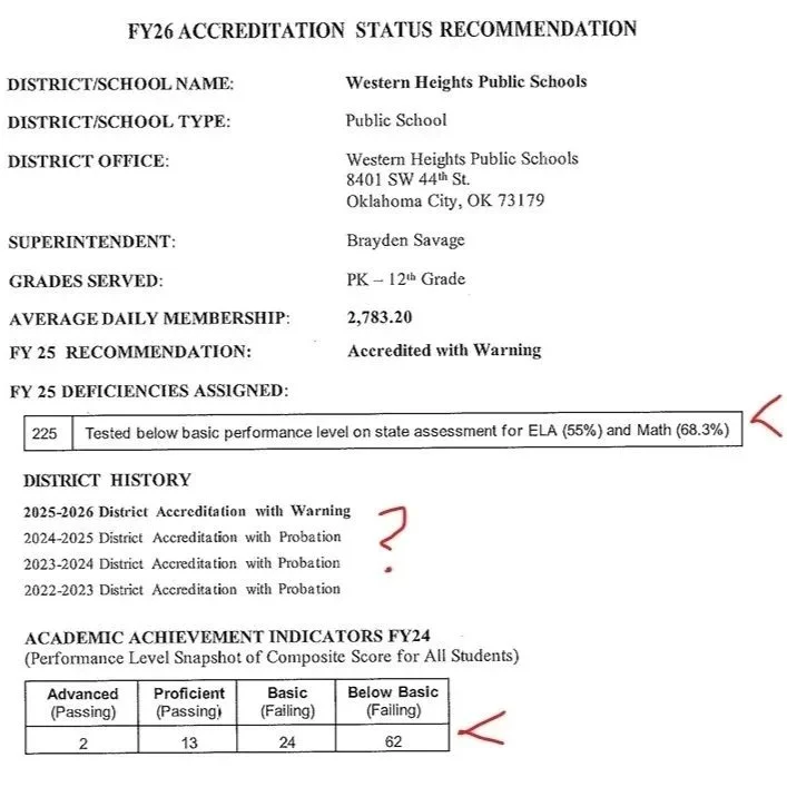Western Heights is a particularly interesting district in southwest Oklahoma City with a troubled history in terms of accountability and low performance. A snip of the Department’s summary is a telling example of the issues that need to be addressed since 86 percent of students did not score "proficient” on the composite of all state tests.