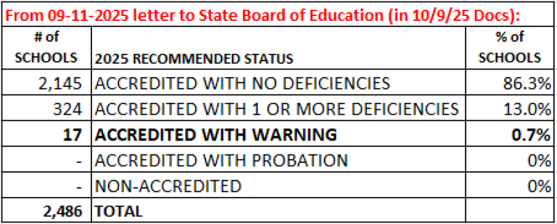 Also, Mr. Walters pushed through new state rules for accreditation that included deficiencies for having more than half of students score “below basic” on state tests of English OR mathematics. As best I can tell, this is the first year (2024) for such a determination so I’m not seeing how districts could have gotten this deficiency two consecutive years, which is the main factor for a “Warning.” That is, unless the deficiencies are from 2023 and 2024 data (or 2024 and 2025?).