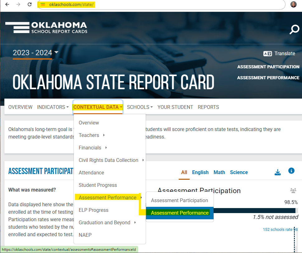 To evaluate any public school’s performance on state tests, see example (right) from the state report card. Go to “Contextual Data” menu and drop down to “Assessment Performance.”