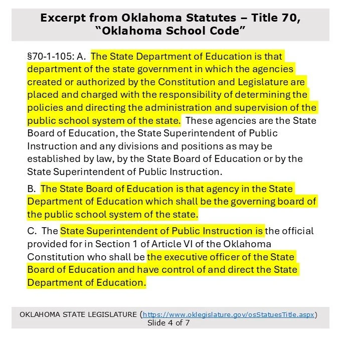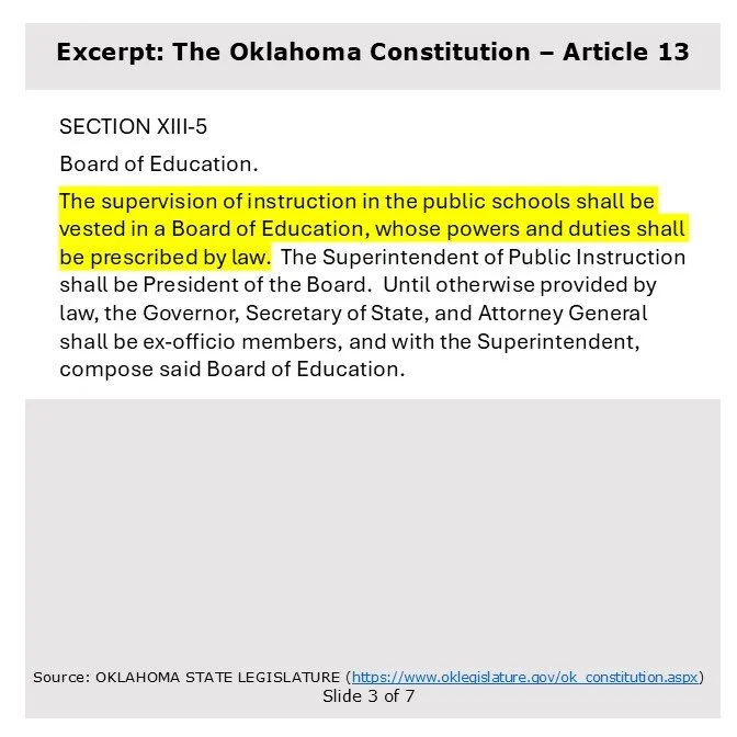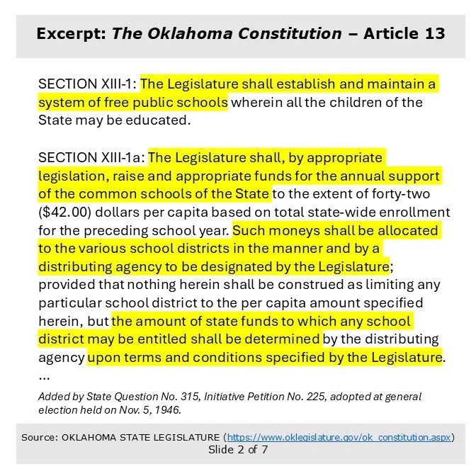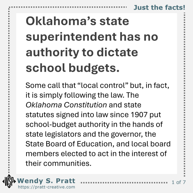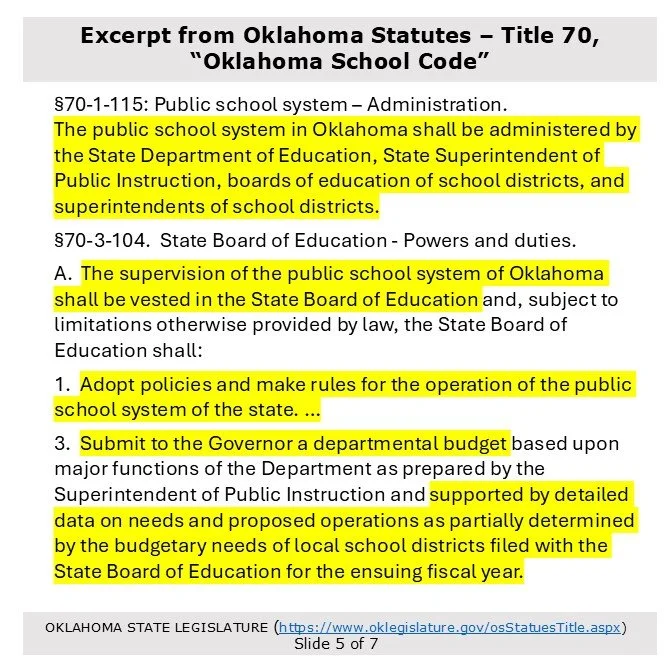 This problem, which should have been solved decades ago, requires an understanding of how school budgets work and willingness to do the job as defined in the Oklahoma Constitution in 1907 and state statutes adopted since. Below are the relevant statutory references.