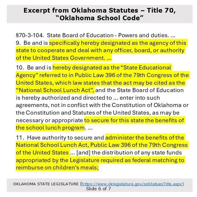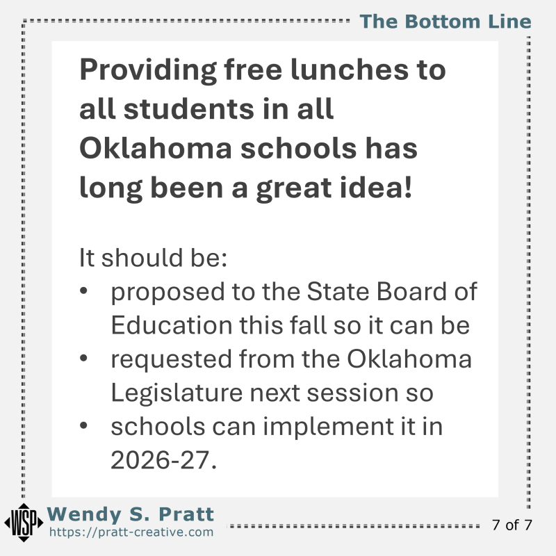 offer free lunches now and which ones cannot afford to do so. The superintendent claims that by eradicating “gross mismanagement and bloated bureaucracies” there would be sufficient funding to cover the cost but offers no proof (again). One example of the disparity: Edmond Public Schools charges $3.30 for lunch while Oklahoma City Public Schools provides free lunches for all students. This is because high-poverty schools get enough federal funding to cover the cost.